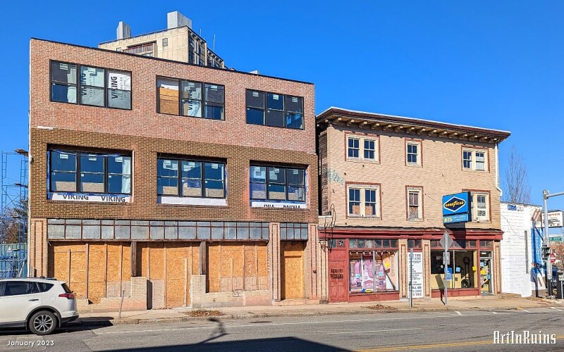 A sliver of an 1829 structure survives under this turn-of-the-20th-century vaudeville theatre turned movie house turned commercial storefronts