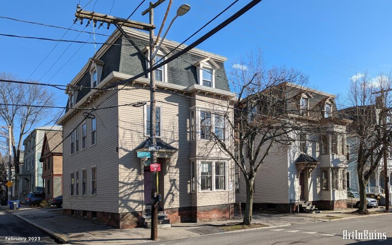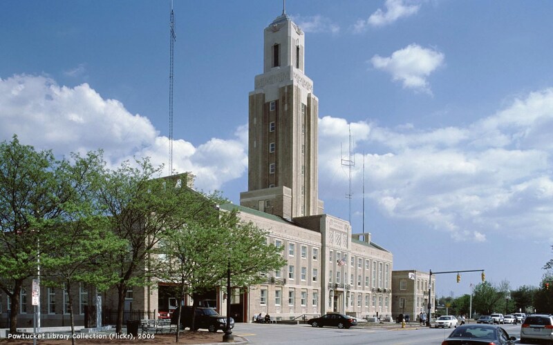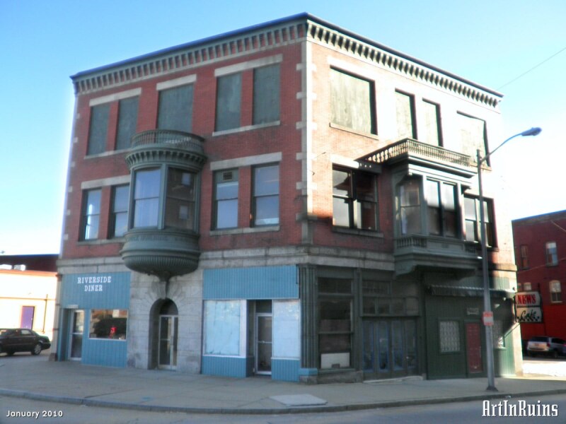 A handsome, if not crumbling, three story brick and granite five-sided commercial building at the gateway to Pawtucket’s Downtown
