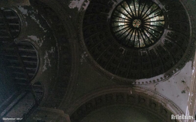 A decaying former banking hall with high cielings and an interior stained-glass lit dome shrouded in copper
