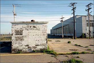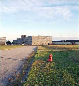 The massive changes exerted upon the Quonset landscape, coupled with the stark aesthetic of Kahn's modern designs, led some at the newly activated base to call for decoration. Captain Andrew McFall, Quonset Point's first Commanding Officer, wrote to the Bureau of Aeronautics requesting $50,000 for "grass and some shrubbery" to improve the base. His claim that "the rather sparse appearance of the architecture of the personnel buildings" needed ornamentation was accepted by the bureau, which allocated $35,000 for landscaping. Though they've grown far beyond their intended size and borders, Quonset's plantings retain their separate identity as "landscaping" distinct from a surrounding landscape that has largely gone wild. General DynamicsThe most prominent feature of Quonset's landscape is an enormous hangar-type structure that dwarfs neighboring Buildings 1, 2 and 406. In the years following the decline of the Naval Air Station, the manufacture of nuclear submarines at General Dynamics' Quonset Point site has come to define the majority of activity on the base as a whole. And though GD relinquished use of Buildings 1 and 2 in the early 1990's, it still lays claim to Bldg. 406 and many other structures located around Airport Road and Roger Williams Way. In most areas of Quonset and Davisville, the occasional "No Photography" sign can safely be regarded as a relic of an earlier era, but the rule is still strictly enforced in the vicinity of any buildings under General Dynamics' control. On many occasions we were met by polite but stern security guards who were concerned that our cameras might be aimed at the wrong thing. Water towers Modern water towers now stand in place of the checkered, barrel-style towers that once distinguished Quonset from the air, the Bay, and nearby roads. Five of the original towers, which appear as landmarks on roadmaps and nautical charts, were demolished in the spring of 1999. Though decrepit in their outward appearance, these structures still proved to be remarkably sound: we watched all morning while demolition contractors attempted to accomplish the job they had told us would take only half an hour. Four tries, three hours, and a truckload of ballast later, the backhoe prevailed and the tower gave way. Warehouses Standing in the center of the large open grass field between 4th and 5th Avenues, one is surrounded on three sides by buildings of monumental scale: the landplane hangars to the east, the Kahn-designed barracks to the west, and the rhythmic row of warehouse types to the south. These warehouses are set at regular angles along the 4th Ave. railroad spur, stretching into the distance. Pairs of bowstring truss buildings stand side by side with several monitor gable warehouses. Their rhythmic order is abruptly punctuated by the austerity of Building 16, the Supply Department. The design of this reinforced concrete building was based around one of the latest storehouse technologies the forklift and the new 4' x 4' pallet system. Celestial navigationQuonset's array of structural mammoths and oddities is compelling in part because of the gesture each makes toward use, a gesture whose meaning becomes estranged as these once-useful buildings slide into decay. One Quonset veteran explained to us that the three vertical sections of Building 457 were used for parachute repair. Another contended that each of the domes contained a replica of the night sky where pilots were trained in night flying. Each explanation suggests an imaginative, form-follows-function approach to interpreting a structure whose use is not immediately evident. We used this same approach in developing quick-reference names for buildings our maps distinguished only by number. We called this complex "The Silos," a name that reflects the agricultural look of the three towers, and the overall Cold War cast of the site. Of the three possible explanations for building 457's "silos," the weirdest turns out to be right: the complex was used for celestial navigation. * Architecture in the National Defense Building Program, Michigan Society of Architects Weekly Bulletin, No. 52, December 30, 1941, p. 52. |
