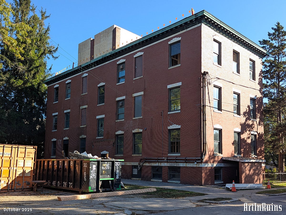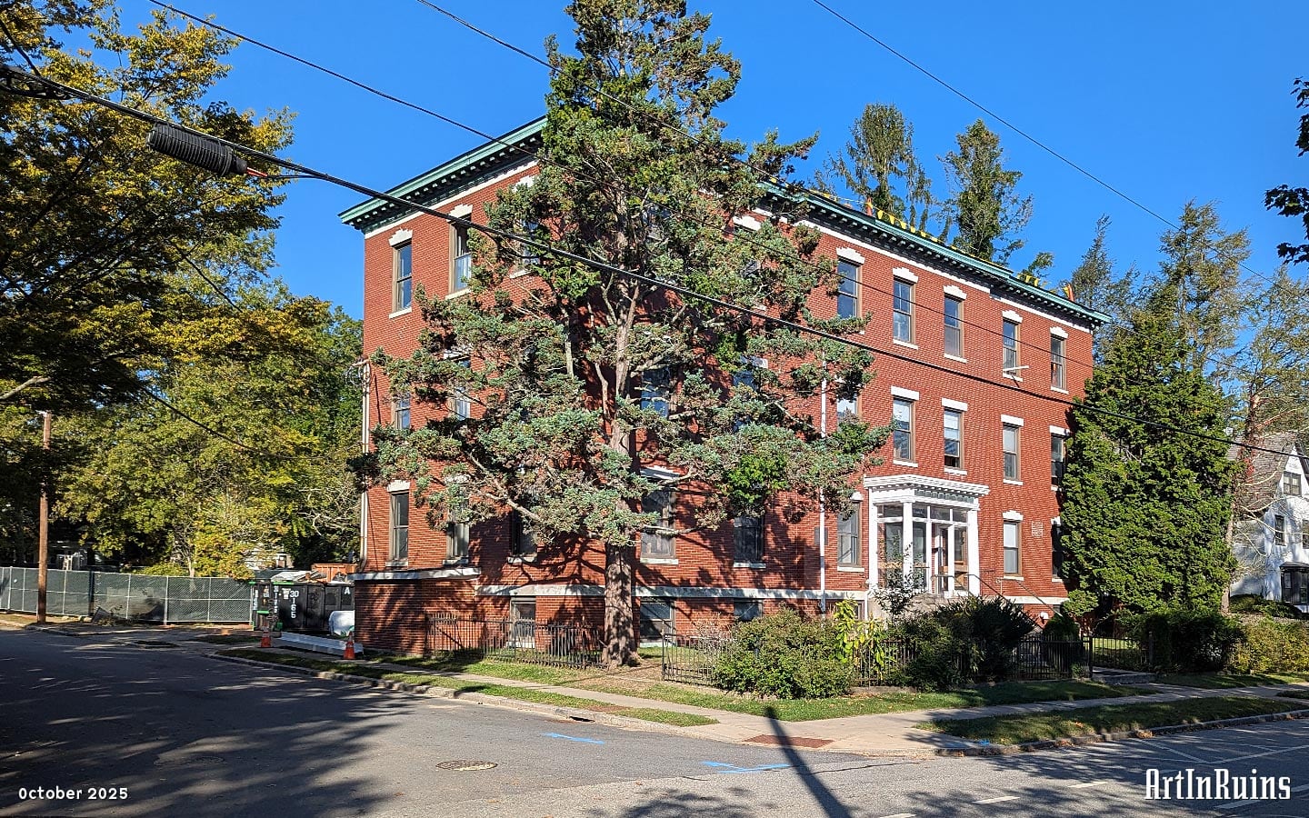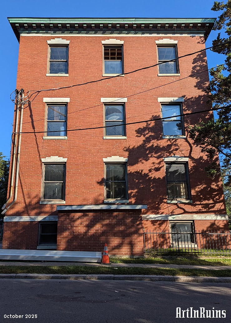 Built as a local hospital before 1920, this handsome brick three story building with symmetrical facade was only used as a surgical center until around 1940 — about 25 years. It spent time as a catholic friary from 1940 until about 1976, or another 36 years. And then finally, it changed religious affiliation and was the home of the New England Academy of Torah until about 2013 — another 40 years. The building changed hands in 2013 and has been vacant and unused for a little over 10 years.