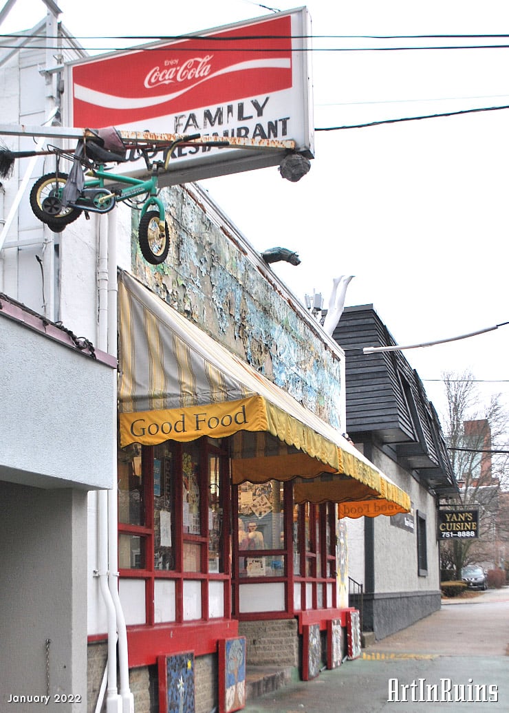 “Grant does a good job… and he loves the blue,” he says after examining the sea foaming over windows that advertise $1.49 breakfast specials. “But I don’t know, I still think he should have painted some women.”