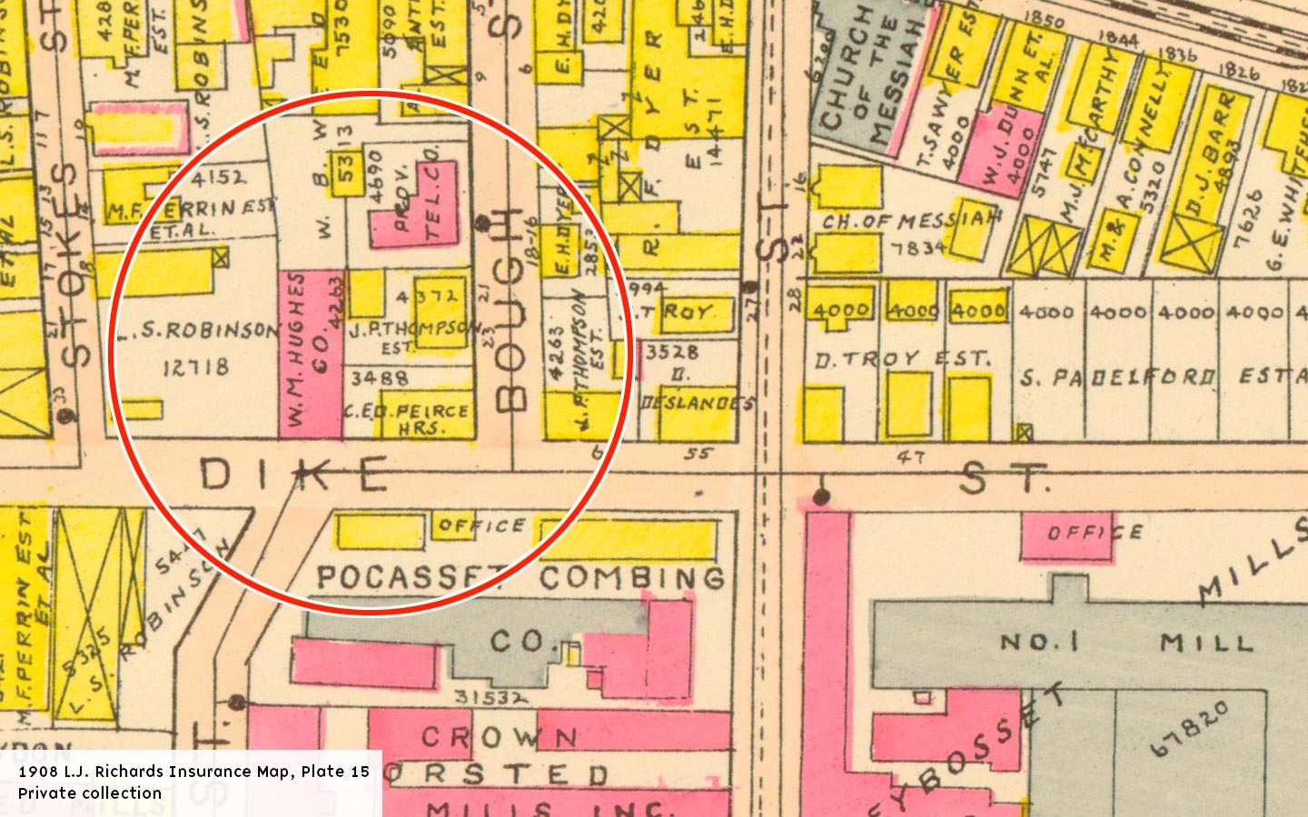 - 1908 L.J. Richards Insurance Map, Plate 15 (private collection) — A narrow building in pink (indicating brick) fronts Dike Street labeled “W.M. Hughes Co.” There are three different wooden structures at the corner of Dike and Bough. The brick building at this location seems to be the two-story portion of the larger building in the next map, which would make this portion of the building older than the rest.