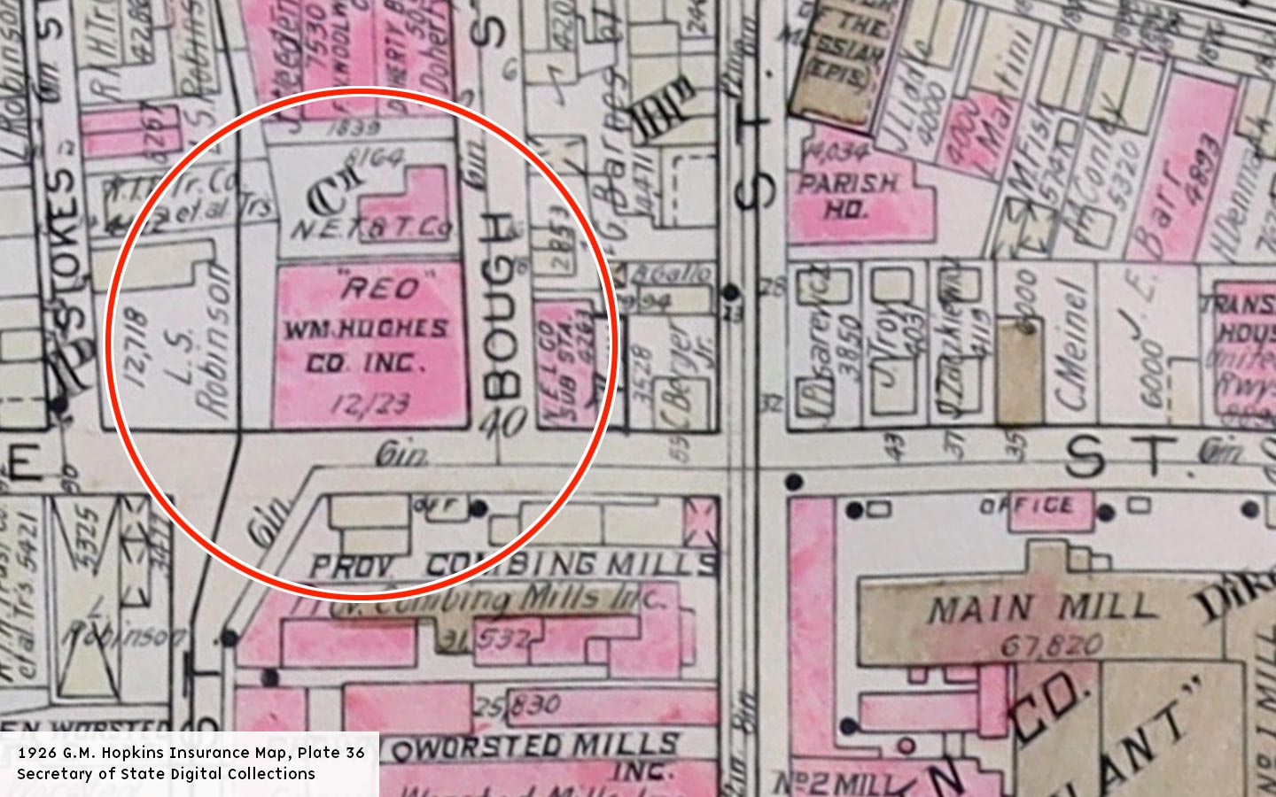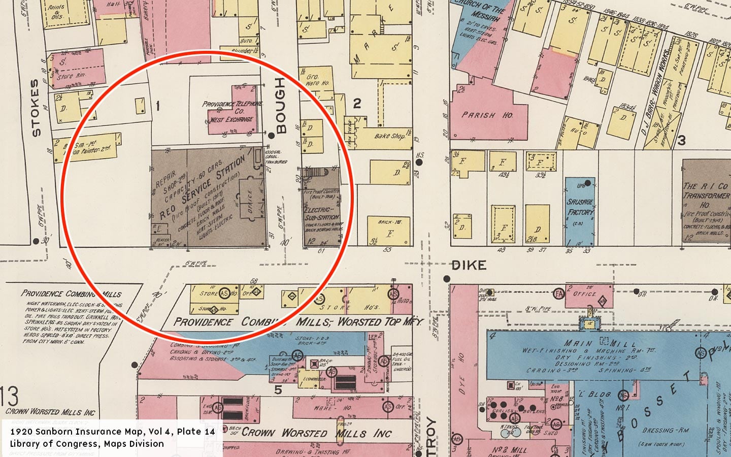 - 1920–1921 Sanborn Insurance Map, Volume 4, Plate 14 (page 17) — A gray brown building occupies the entire southeastern corner of Bough and Dike Streets. It has labels that read as follows: Repair Shop 2nd, capacity 60 cars, Reo Service Station, Fireproof construction, built 1917, concrete floor and roof, brick walls, heat: steam, lights: electric.