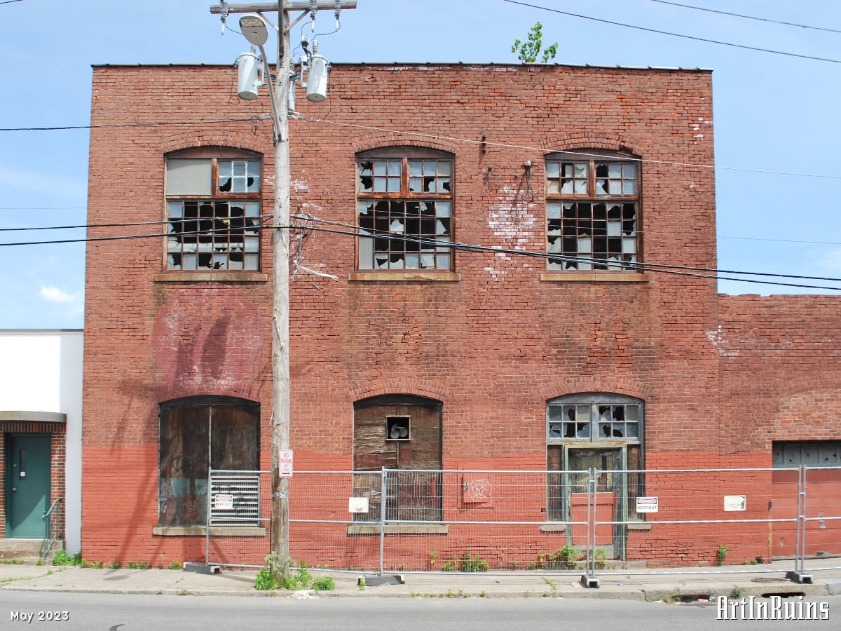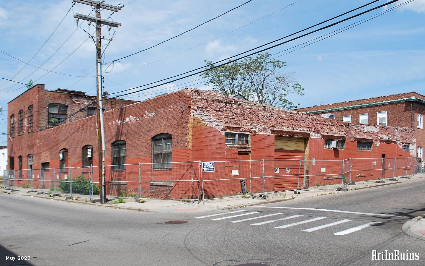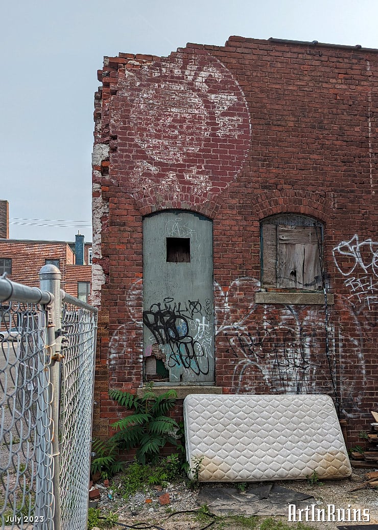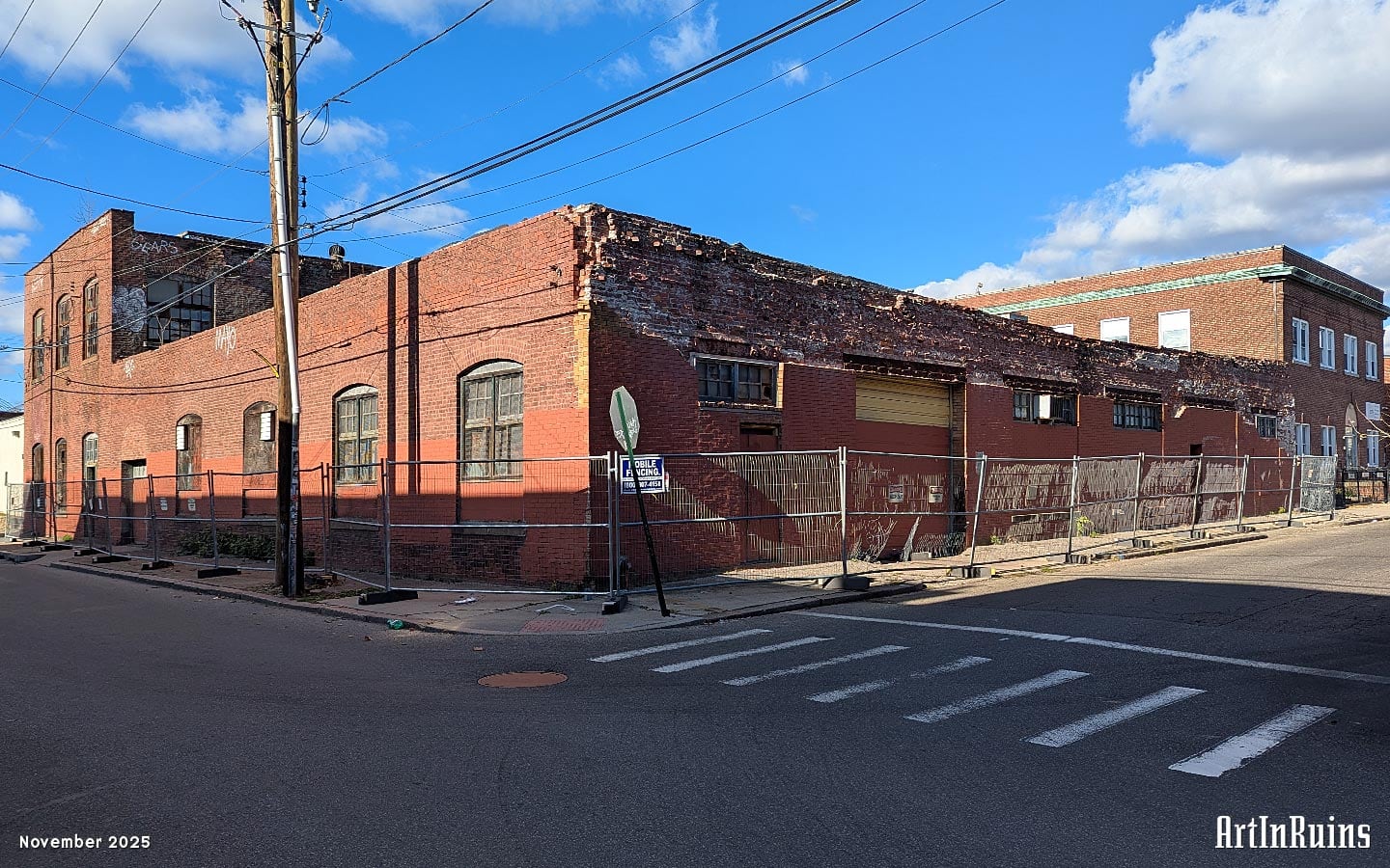 The building is surrounded by construction fencing and has been since our 2018 photo. It is not being repaired or maintained but it is also not being actively torn down.