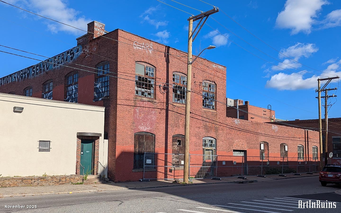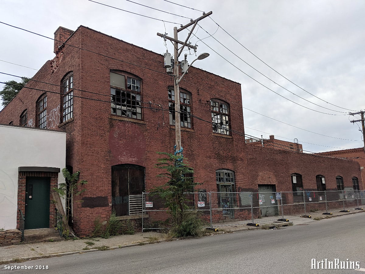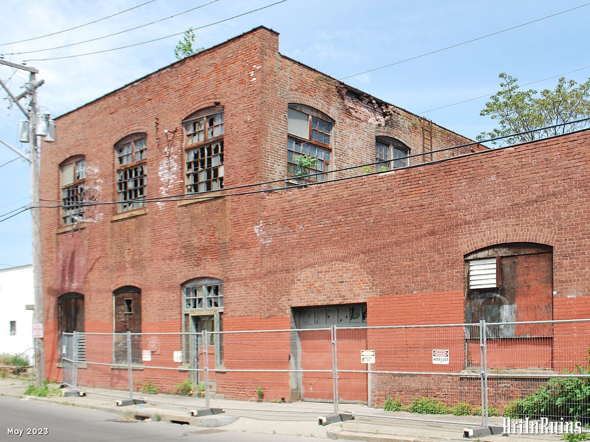 The building is surrounded by construction fencing and has been since our 2018 photo. It is not being repaired or maintained but it is also not being actively torn down.