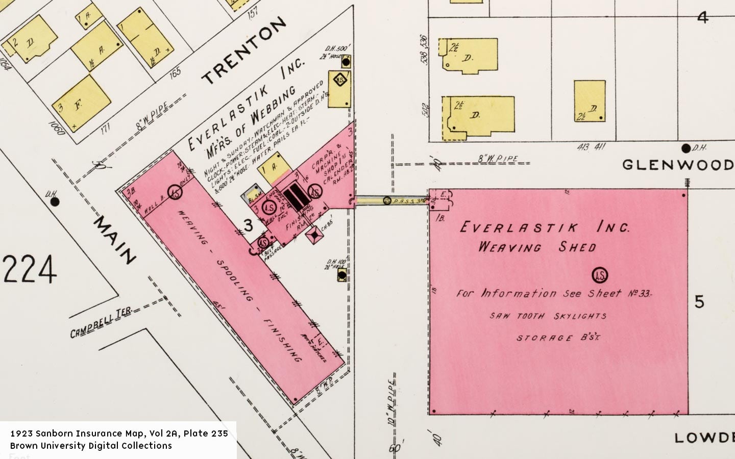 This 1923 Sanborn map shows the floorplans of the weave shed and the Smith Webbing building across the street, connected by a second story elevated walkway. Both are labelled with the company name “Everlastik”