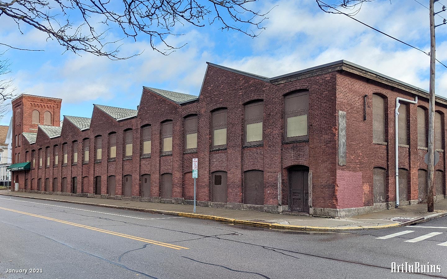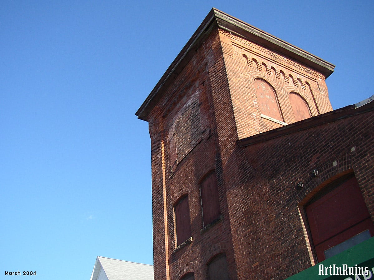 The building’s fenestration has rough-hewn granite for window sills with arched headers in brick. On the northwestern corner is a square-plan four-story tower with a flat roof and a decorative cornice. Most if not all openings have been blocked by brick or plywood.