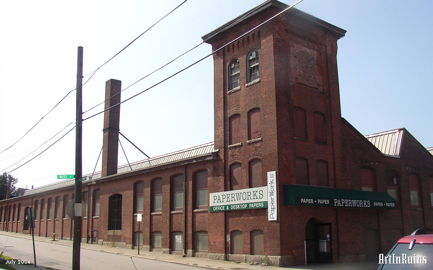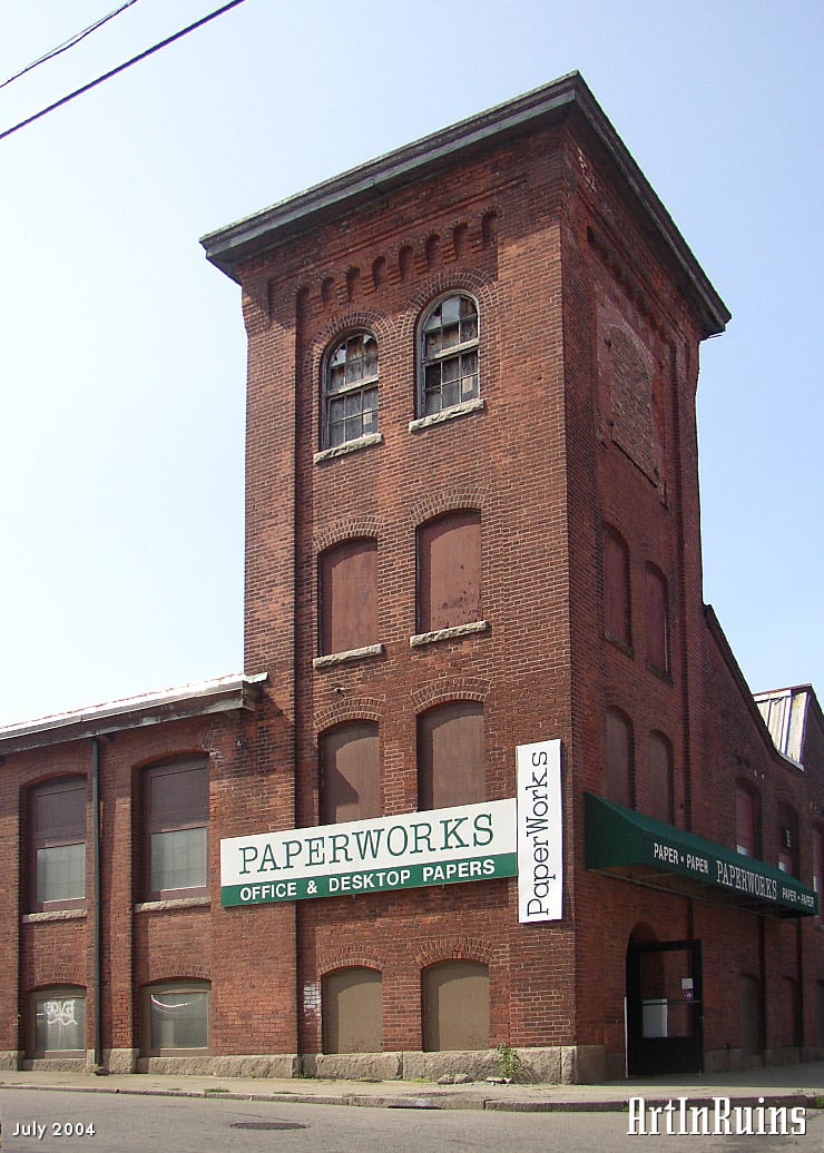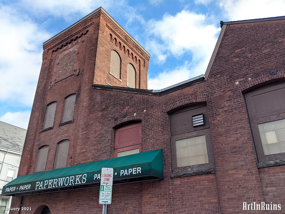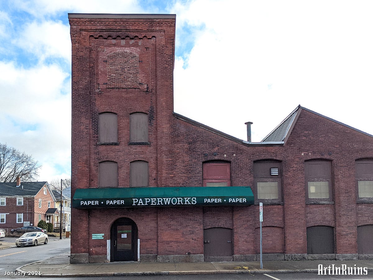 The former weave shed is now a paper supply warehouse in two modes. The upper floor, which is the ground floor on the Pawtucket Avenue side, is the warehouse for distributor Central Paper. The basement, with entrance on the West Street side, is Paperworks, which is open to the public and offers warehouse prices for small and medium quantity paper quantities.