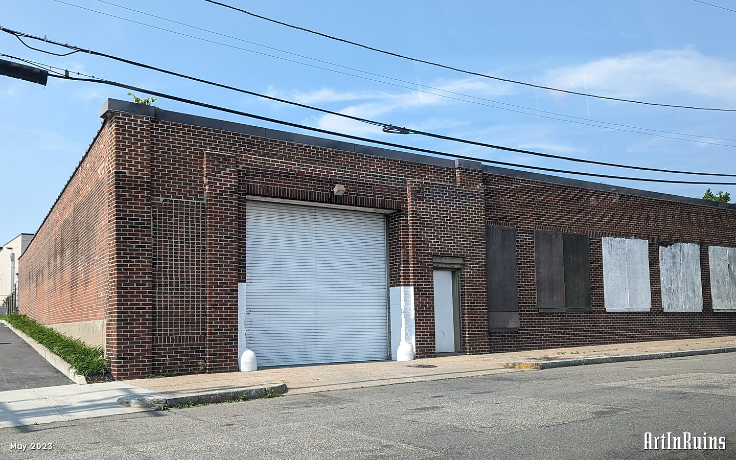 The building’s facade along Branch Avenue is asymmetrical in plan with a group of two windows, a door, and two windows on the eastern side of the elevation and another single door entrance, a former garage door entrance, a small window, and a larger commercial plate glass window on the western side. Red brick is used throughout with rectangular openings and a flat parapet roofline that steps up slightly around the garage door opening.